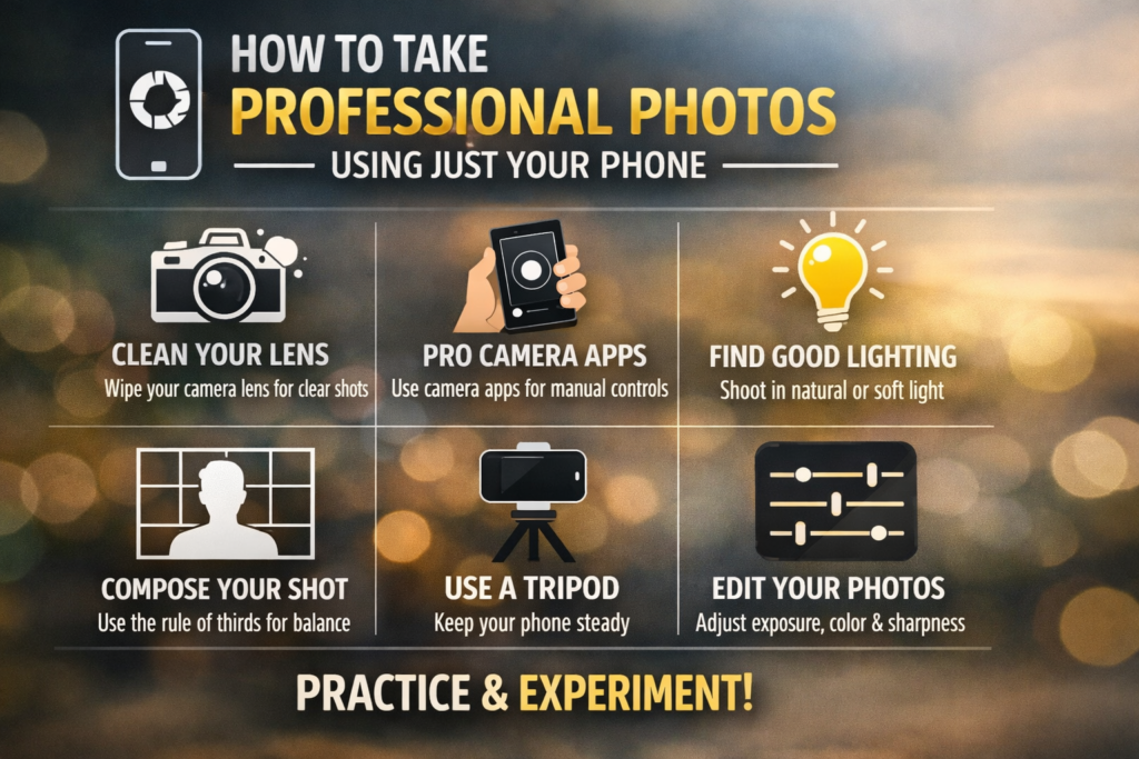 Taking professional photos using just your phone is entirely possible with the right approach. By understanding your camera, focusing on composition, leveraging natural light, stabilizing your shots, experimenting with angles, and using editing apps, you can capture high-quality images that rival those taken with professional cameras. With consistent practice, attention to detail, and a creative mindset, your smartphone can become a powerful tool for professional photography in 2026.